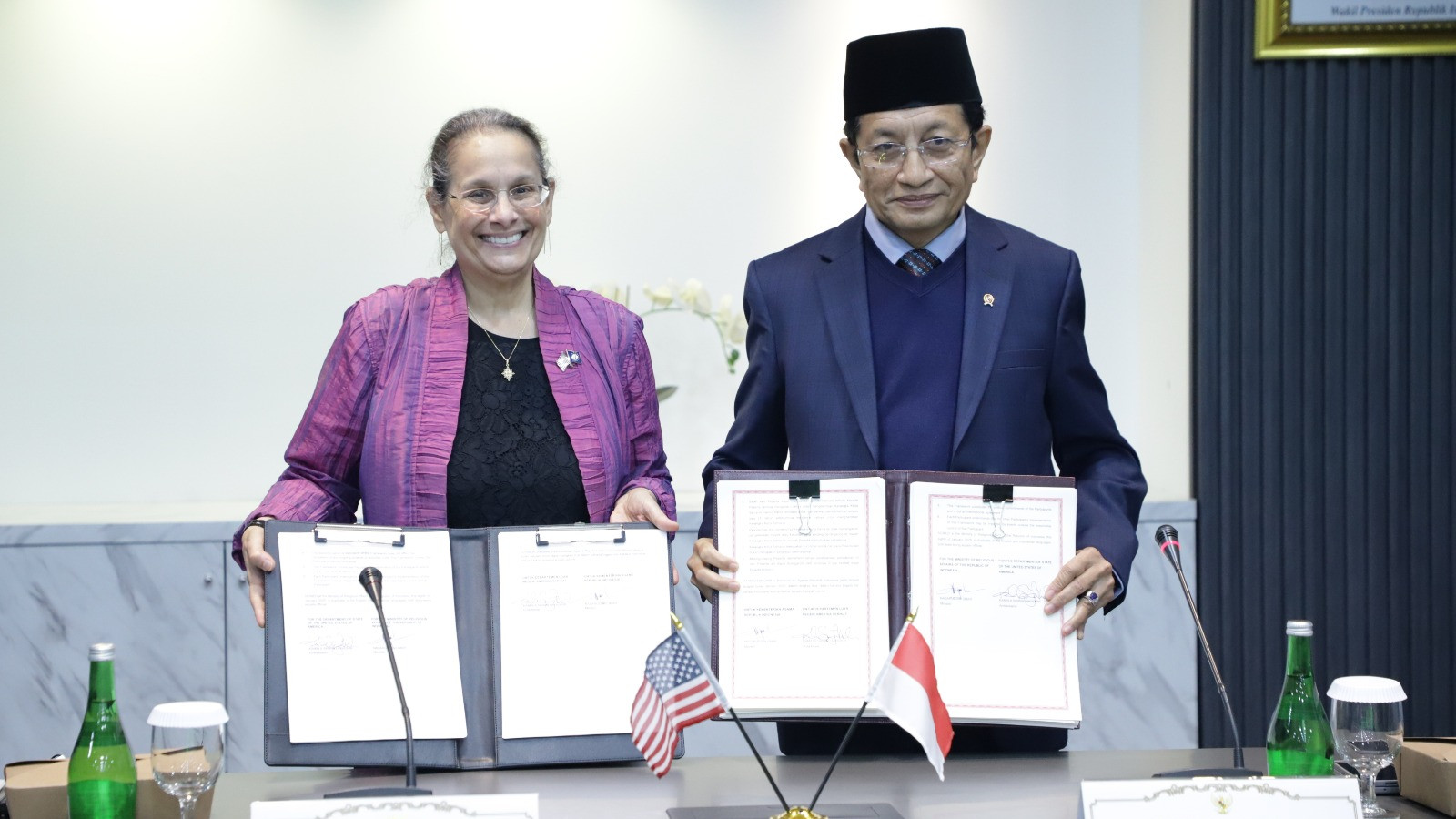 CHANNEL8.CO.ID, JAKARTA — Menteri Agama (Menag) Republik Indonesia, Profesor Nasaruddin Umar bersama Duta Besar Amerika Serikat (Dubes AS) untuk Indonesia Kamala S Lakhdhir menandatangani nota kesepahaman (MoU) untuk bekerja sama dalam perluasan Program Fulbright Departemen Luar Negeri AS. Ini merupakan program beasiswa dari Pemerintah AS ke lembaga dan individu binaan Kementerian Agama.